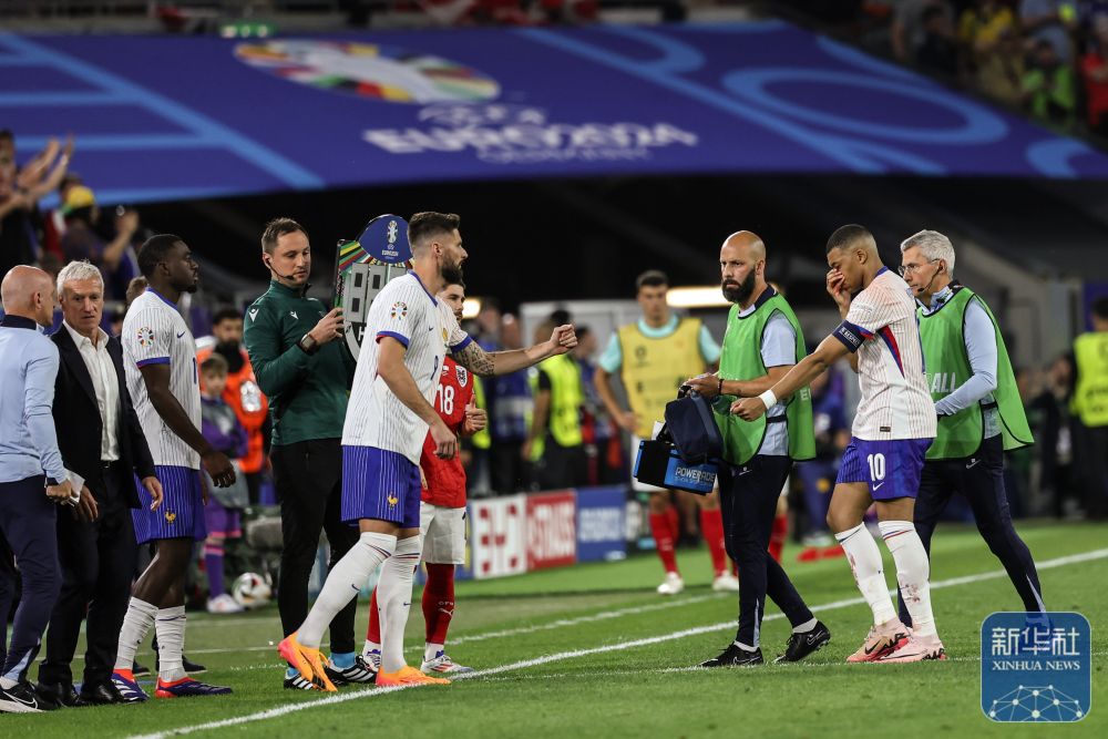 法国队球员基利安·姆巴佩(右二)因鼻子受伤被队友吉鲁(右四)替换下场。