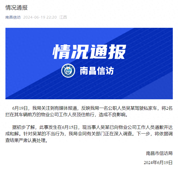 6月19日夜间,南昌信访局发布情况通报: