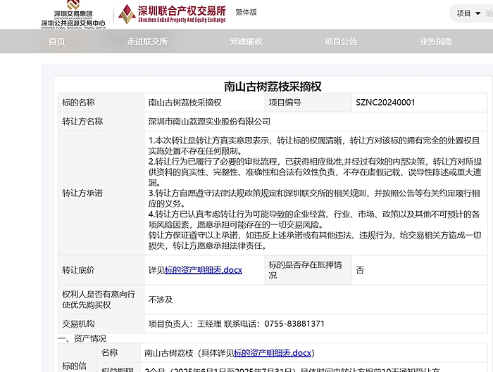 此次古树荔枝的转让方为南山荔源实业股份有限公司是由南山街道南山村原居民组成的集体合作股份公司。南山街道相关工作人员介绍,“这是我们街道打造南山古树荔枝特色IP的新尝试!”南山荔枝历史悠久、味道鲜美,南山街道把辖区古树荔枝都当作宝!仅南山荔源实业股份有限公司就有1270棵百年古荔树。希望通过此举,用活南山荔枝资源,提升荔枝产业价值空间。
