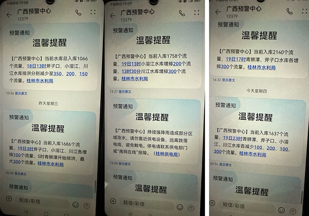 澎湃新闻注意到,很多桂林本地居民的手机都收到过相关预警消息。据当地居民收到的预警消息,6月18日,桂林水文中心发布提醒称,预计6月18日6时前后,漓江桂林市城区河段可能出现超预警戒水位1.7米左右洪水,请注意防范。6月18日13时许,桂林市水利局发布提醒称,当前水库总入库1066个流量,18日13时斧子口、小溶江、川江水库排洪分别减少至350、200、150个流量。