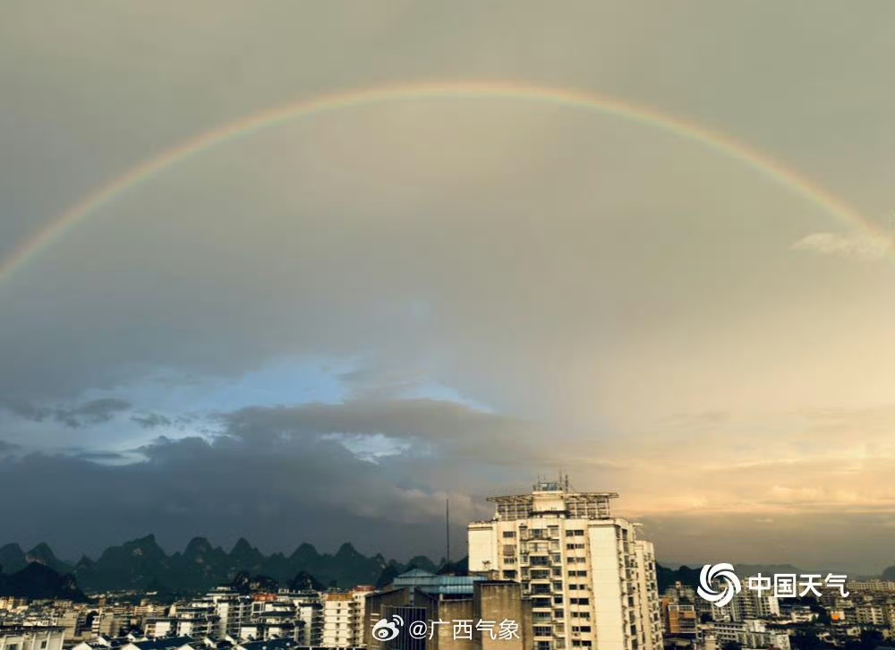 随着雨带北移,广西桂林本轮强降水已趋于结束。20日傍晚,桂林市区还出现了彩虹。