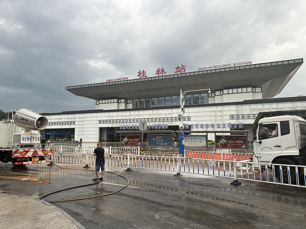 20日18时许,桂林站门口道路正在清淤。