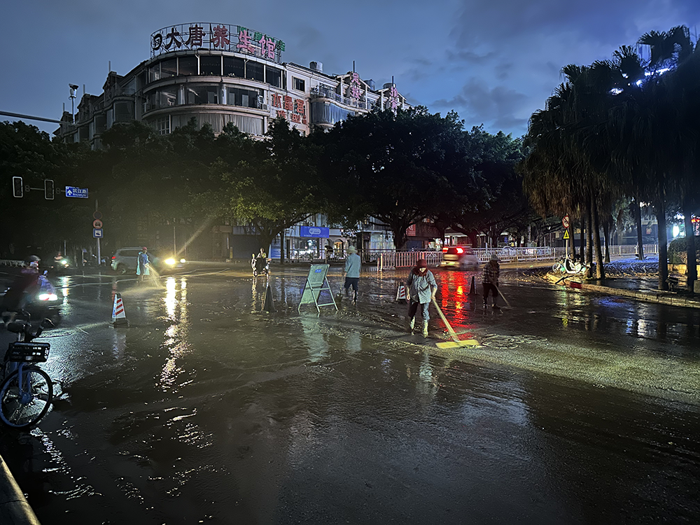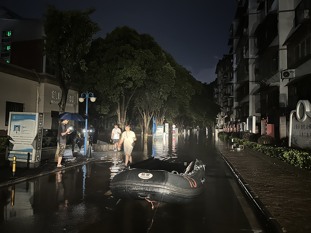20日21时许,南溪山医院住院部附近的路面仍有积水,有人涉水通行。