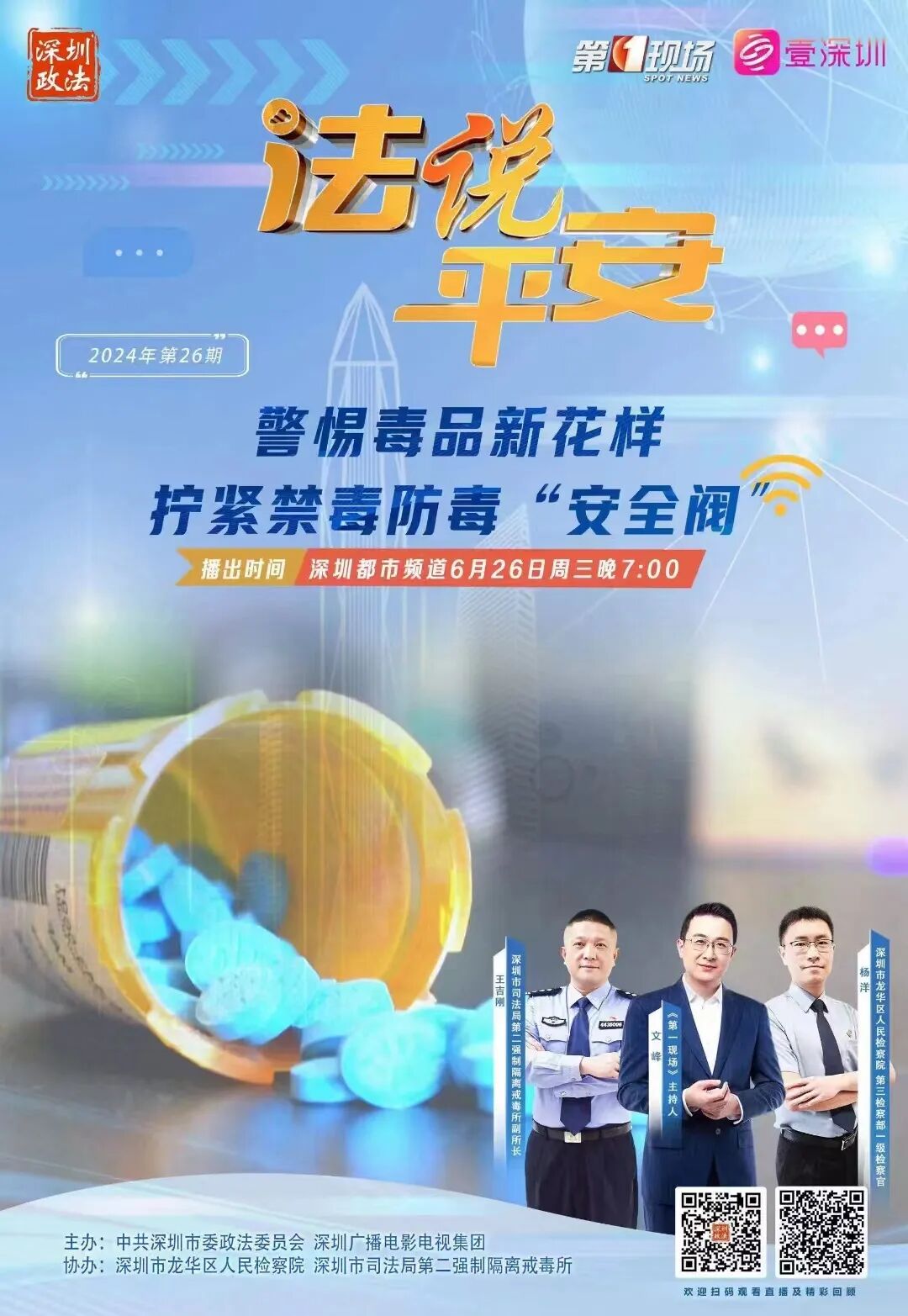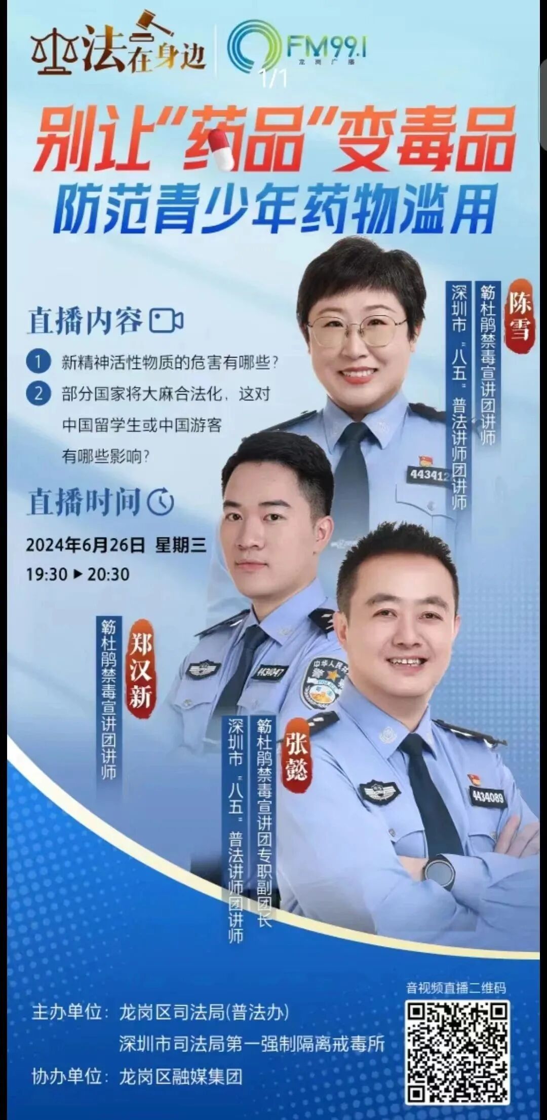 6月26日,深圳市司法局第一强制隔离戒毒所、龙岗区司法局携手龙岗区融媒集团龙岗广播FM99.1共同举办《法在身边》第四期音视频同步直播栏目。深圳市“八五”普法讲师团讲师、深圳强戒一所簕杜鹃禁毒宣讲团讲师围绕“别让‘药品’变毒品、防范青少年药物滥用”主题,面向群众,尤其是针对青少年、中国留学生、中国游客开展禁毒宣讲,引导人民群众牢固树立防毒意识,遵守国家法律法规。