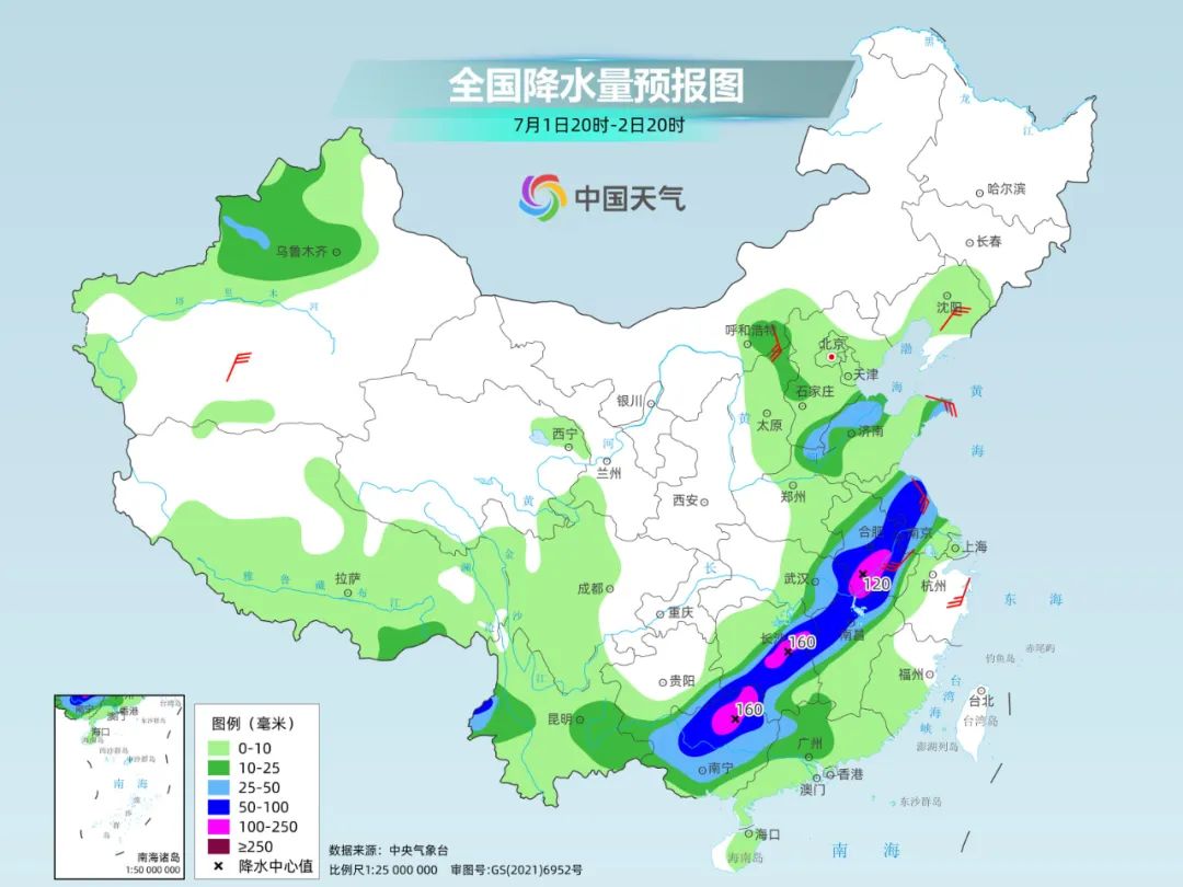 6月30日至7月2日,强降雨仍将集中在广西中北部、贵州至长江中下游一带。值得注意的是,湖北东部、湖南中部、安徽南部、江西北部等地累计雨量较大,未来强降雨区域与前期高度重叠,需警惕山洪、中小河流洪水、滑坡等次生灾害。
