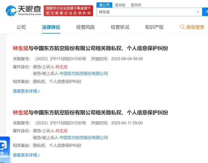天眼查法律诉讼信息显示,林生斌曾因隐私权、个人信息保护纠纷起诉中国东方航空股份有限公司,该案曾于2023年两次发布开庭公告,案件审理法院为上海市浦东区人民法院。
