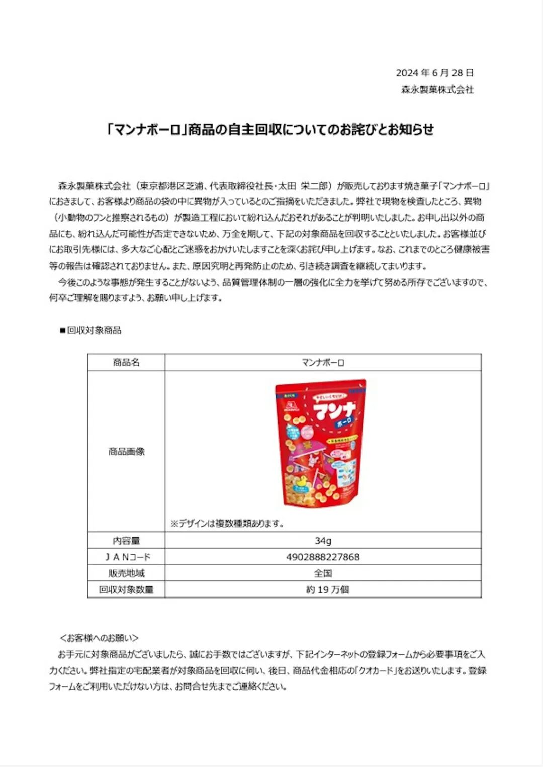 日本“森永制果株式会社”近日在官网发布产品回收公告,号称收到投诉,零食“マンナボーロ”含有异物,实际检查推测可能是动物粪便。