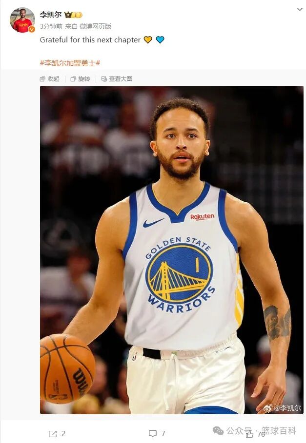 同日晚些时候,李凯尔也在社交媒体平台上晒出身披勇士球衣的P图,并写道:“Grateful for this next chapter 💛 💙。”