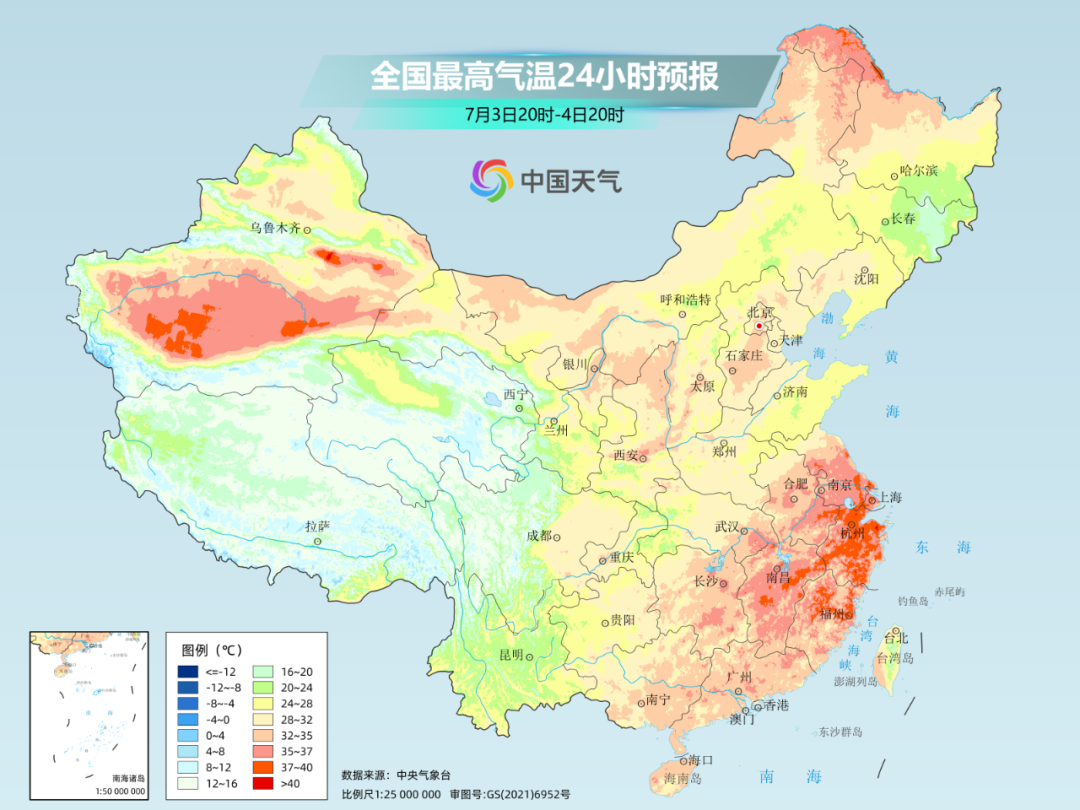 进入7月,3日当天,我国一南一北有两片地方热得十分突出。一片在浙江、江西、福建一带,从气温实况图上可以肉眼可见“热得发红”。而另外一片在我国最北端的“鸡冠”上,黑龙江西北部、内蒙古东北部等地也热到“红红火火”。