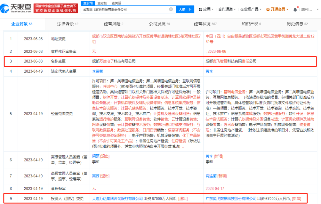 在数据中心领域,奥飞数据收购成都万达电子科技有限公司(以下简称成都万达电科)100%股权,并更名为成都奥飞智算科技有限责任公司。