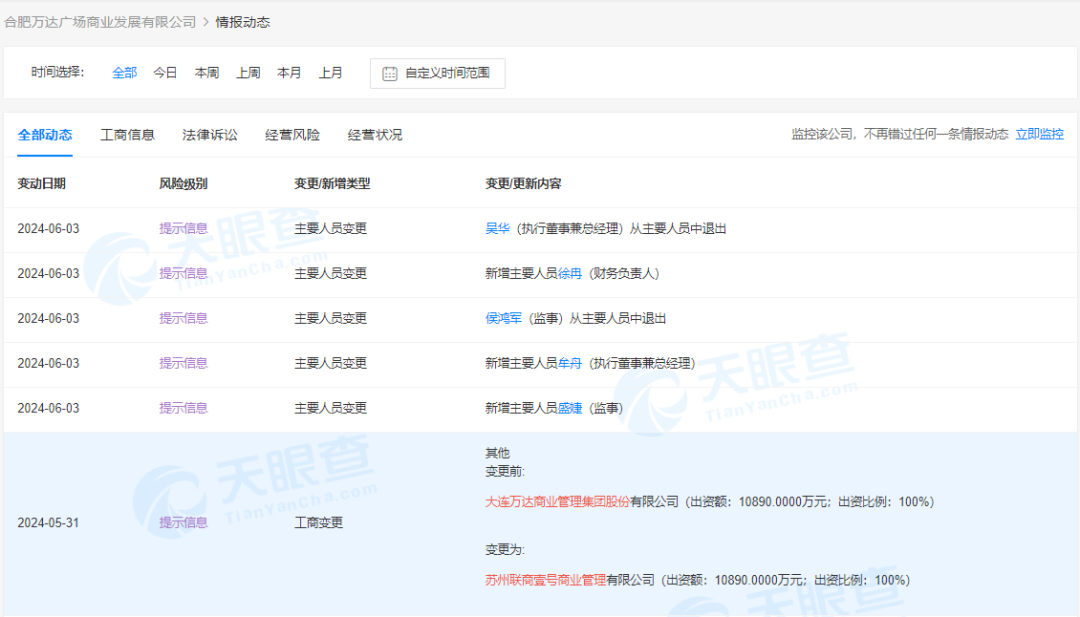 比如,5月31日,合肥万达广场商业发展有限公司发生多项工商变更,原全资股东万达商管退出,新增全资股东苏州联商壹号商业管理有限公司(以下简称联商壹号)。