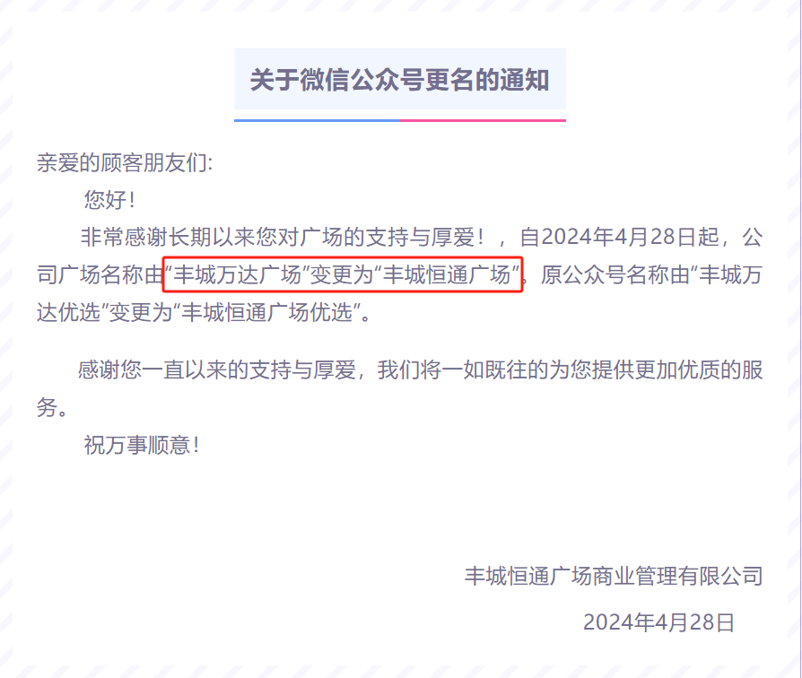 4月下旬,丰城万达广场商业管理有限公司易主,并更名为丰城恒通商业管理有限公司。该公司总经理余小军表示,公司管理层会整体调整业务,引进全国知名头部品牌,以满足丰城目前的业态品类需求。