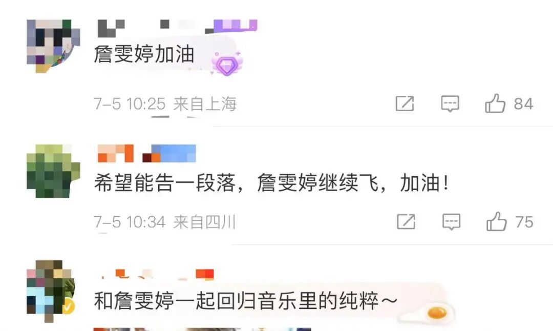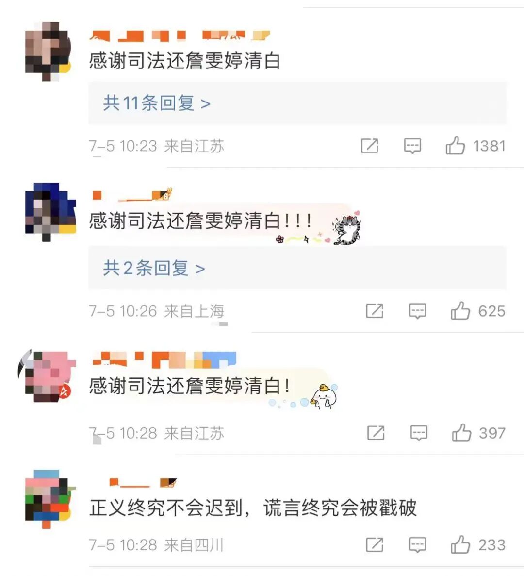 对此,网友纷纷表示,“感谢司法还詹雯婷清白”“詹雯婷加油”“和詹雯婷一起回归音乐里的纯粹”。