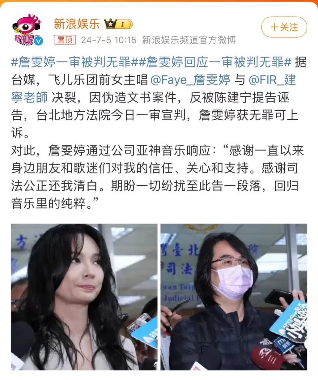 7月5日,据台媒报道,F.I.R.飞儿乐团前主唱詹雯婷被检方起诉涉嫌诬告昔日恩师、键盘手陈建宁伪造文书一案,台北地方法院一审宣判,判决詹雯婷涉诬告无罪,全案仍可上诉。