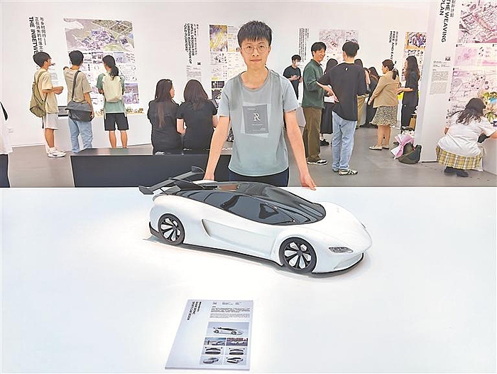 展区中,一个黑白相间、线条流畅且造型独特的跑车模型十分醒目,给人一种跑起来轻盈而迅猛的感觉。这正是深技大学生许锦凌在学院教授杜鹤民的指导下,为知名新能源汽车品牌比亚迪设计的概念跑车。