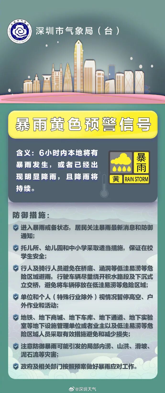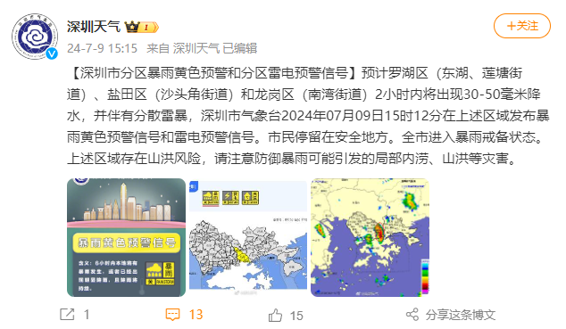 深圳市气象台7月9日15时12分发布分区暴雨黄色预警和雷电预警:预计罗湖区(东湖、莲塘街道)、盐田区(沙头角街道)和龙岗区(南湾街道)2小时内将出现30-50毫米降水,并伴有分散雷暴。请市民停留在安全地方。全市进入暴雨戒备状态。上述区域存在山洪风险,请注意防御暴雨可能引发的局部内涝、山洪等灾害。