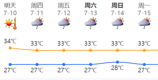 预计10日多云间晴天,间中有短时(雷)阵雨,部分地区雨势较大,天气持续炎热。11-13日副高减弱,云量增多,有阵雨或雷阵雨,局地可达暴雨,炎热天气略有缓解。需继续防范持续炎热以及局地雷阵雨天气的影响。