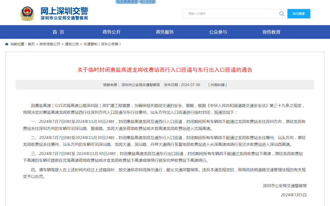 原经龙岗收费站下高速的车辆可提前在沈海高速荷坳收费站或水官龙岗收费站下高速或继续行驶至坑梓收费站下高速绕行。