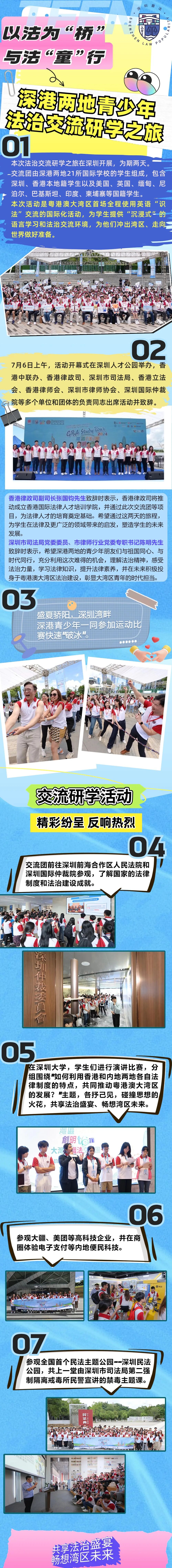 7月6日,深圳市司法局、深圳市普法办公室联合香港律师会主办,以“湾区‘法’展创明TEEN”为主题的大湾区青少年法治交流研学活动在深圳人才公园开幕,开幕式嘉宾为香港中联办法律部部长刘春华,香港律政司副司长张国钧,深圳市司法局党委委员、市律师行业党委专职书记陈明,香港律师会会长汤文龙等多个单位和团体的负责人,来自21所国际学校有深圳、香港以及美国、英国等9个国家与地区的中学生参与本次交流研学活动。