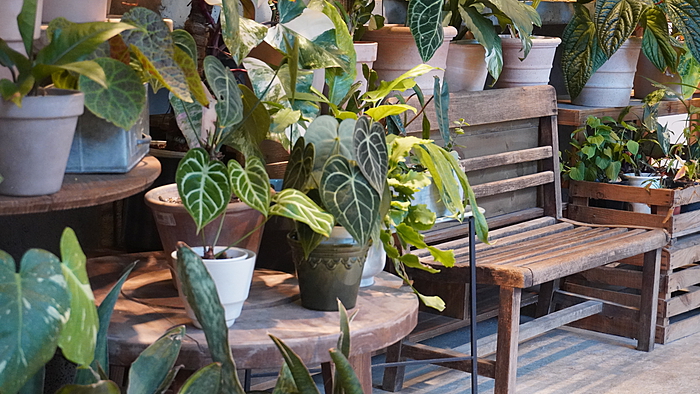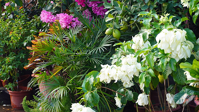这里的植物以盆栽为主,比寻常花卉市场多了几分鲜活的生命力。每株植物都好像竭尽全力在生长,负责开花的,便把花开得轰轰烈烈,开到爆盆也不休不止;以叶为美的,便把枝叶发得绿油油的,自成一片繁茂葱郁的小天地。
