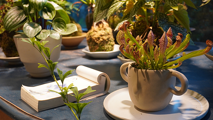除了常规的植物外,店里绿色的植物墙和充满自然气息的微观造景也有很高的人气。二者一大一小,都运用了很多苔藓来布景,再添置上绿植和小手办,构建起一个室内童话世界。