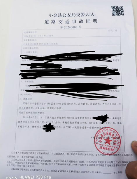 小金县公安局交警大队出具的道路交通事故证明显示,现场位于小金县日尔乡350国道1030公里150米处,沥青路面,路面潮湿。西往小金县城,东往日隆镇方向,北是山体,南侧是小金河。
