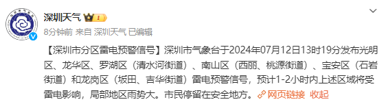 深圳市气象台于2024年07月12日13时19分发布光明区、龙华区、罗湖区(清水河街道)、南山区(西丽、桃源街道)、宝安区(石岩街道)和龙岗区(坂田、吉华街道)雷电预警信号,预计1-2小时内上述区域将受雷电影响,局部地区雨势大。市民停留在安全地方。