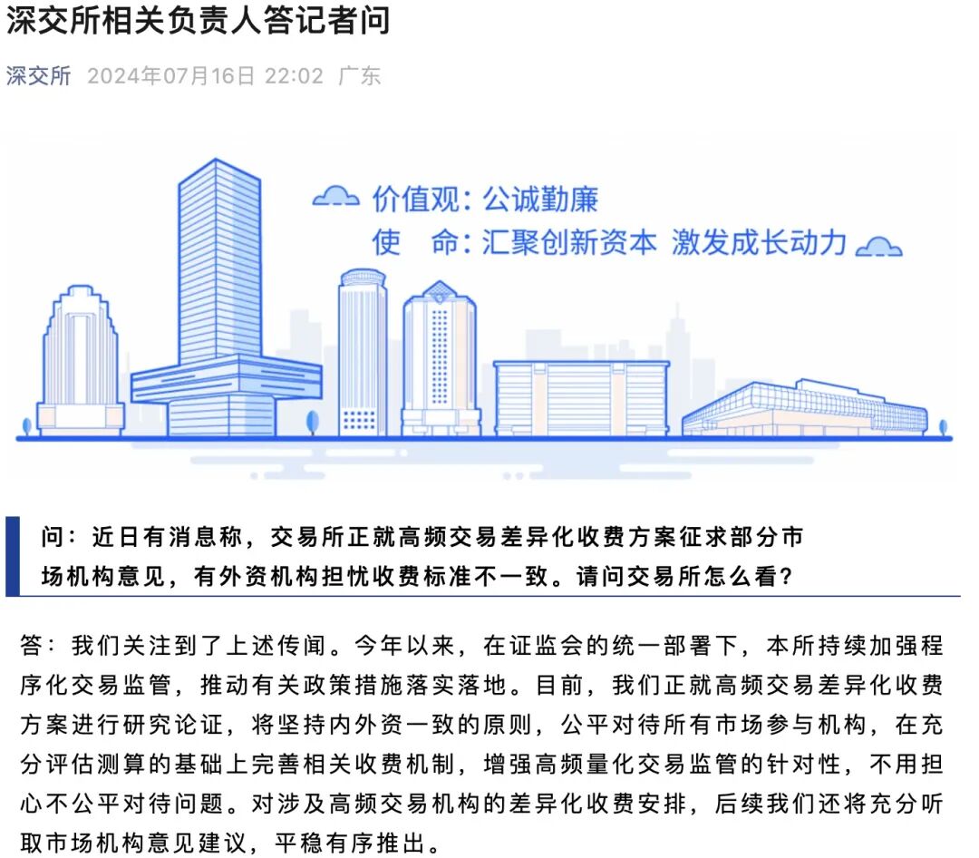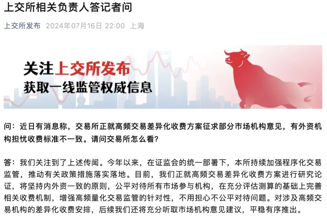 近日有消息称,交易所正就高频交易差异化收费方案征求部分市场机构意见,有外资机构担忧收费标准不一致。请问交易所怎么看?