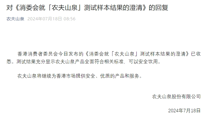 对此,农夫山回应表示:香港消费者委员会今日发布的《消委会就‘农夫山泉’测试样本结果的澄清》已收悉。