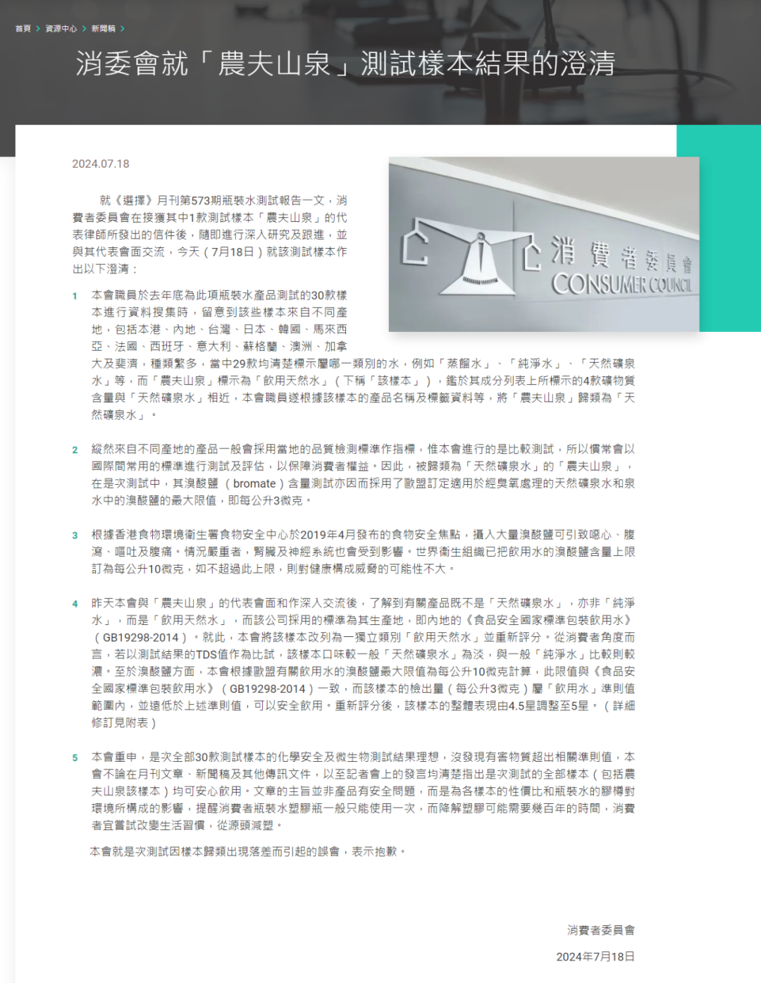 7月18日,香港消委会官网发布澄清声明称,昨天香港消委会与农夫山泉的代表会面和作深入交流后,了解到有关产品既不是天然矿泉水,亦非纯净水,而是饮用天然水,而该公司采用的标准为其生产地,即内地的《食品安全国家标准包装饮用水》(GB19298-2014)。就此,香港消委会将该样本改列为一独立类别饮用天然水并重新评分。从消费者角度而言,若以测试结果的TDS值作为比试,该样本口味较一般天然矿泉水为淡,与一般纯净水比较则较浓。