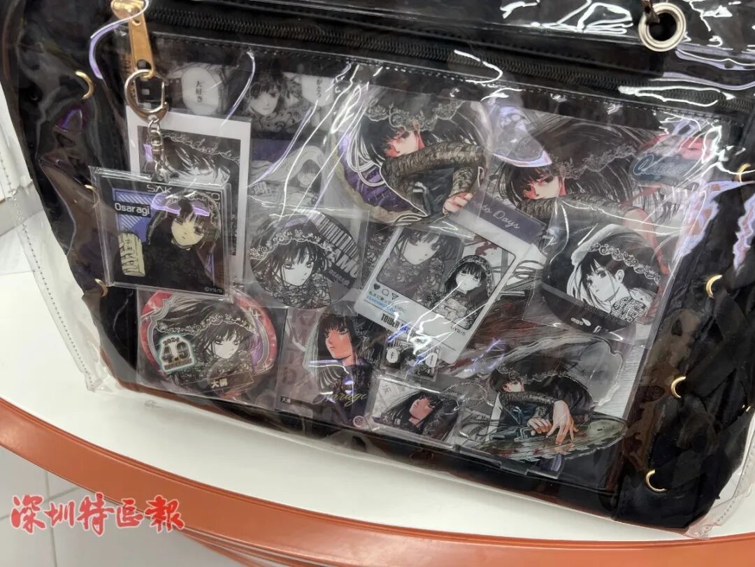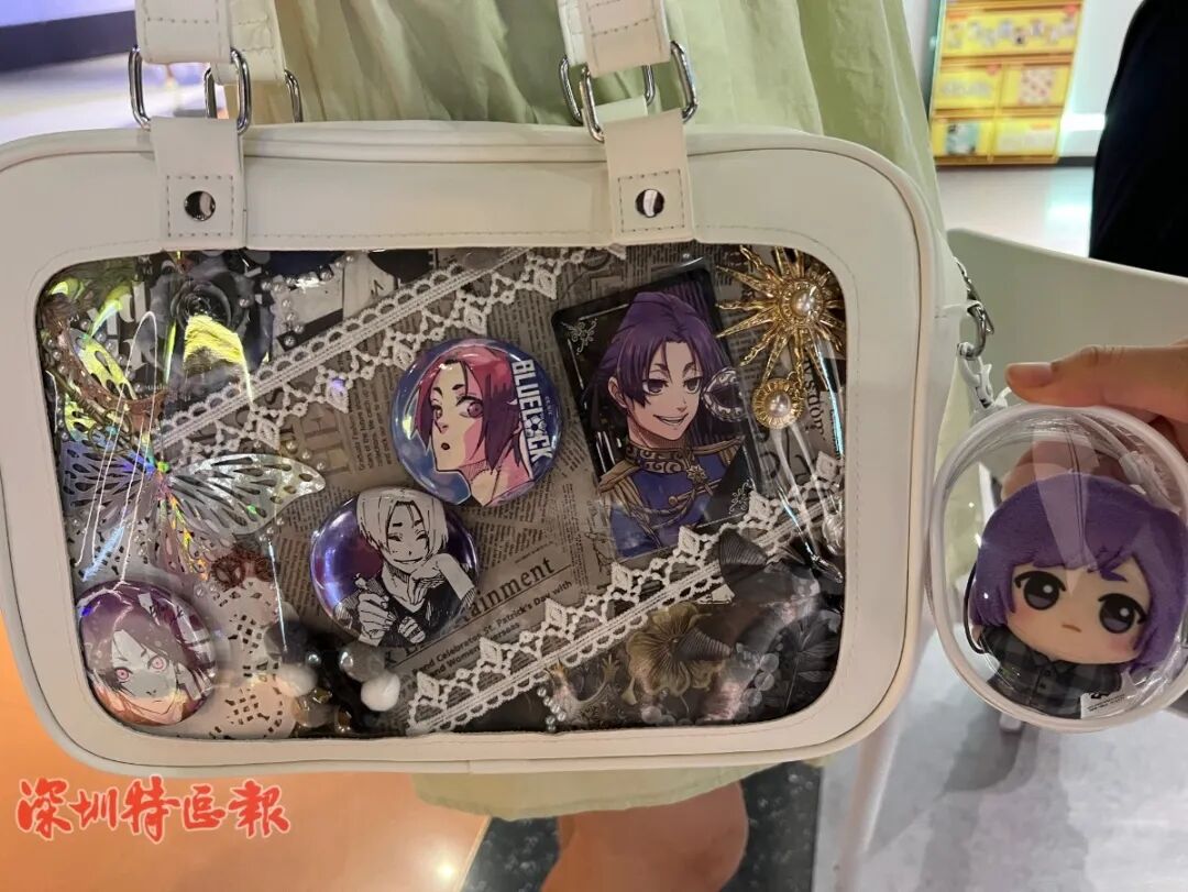 深圳特区报记者注意到,在“谷子店”商区,几乎人人都有一款自己设计的“痛包”,二次元老师们还会根据自推(自己喜欢的角色)的发色、服装等搭配不同颜色的包袋和谷美(周边的装饰品)。