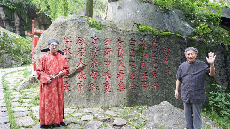 在这里,现代诗人商子秦和“王维”“李白”“杜牧”“韩愈”相遇,古今诗人跨越千年的对话,畅谈关于终南山的诗歌,让采风团一行震撼不已。商子秦以当代诗人的身份,向唐代几位伟大的诗人汇报他们关于终南山的诗作在今天受到了何种欢迎,也让几位诗人甚感欣慰。采风团一行还与“李白”进行唐诗“飞花令”,让现场充满了欢声笑语。在翠华山影壁处,商子秦和饰演“王维”的青年学者史飞翔共同带领采风团齐诵王维的《终南山》,现场气氛达到高潮。