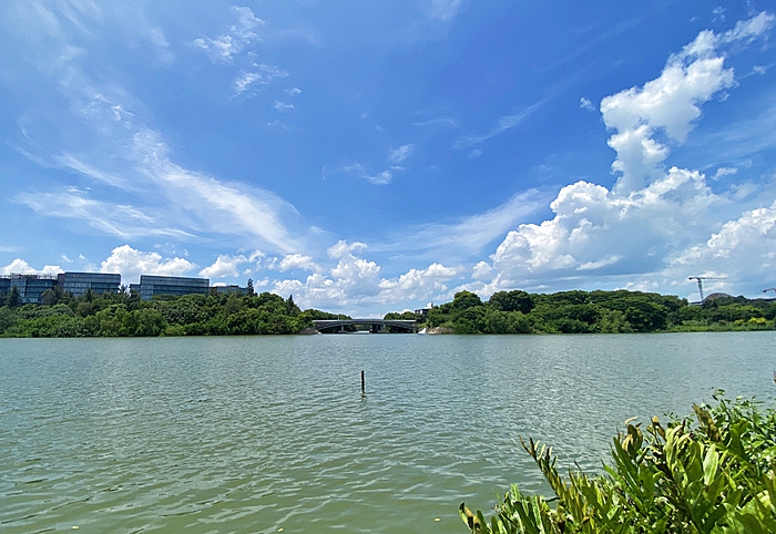 园内景观主要集中在两个湖——红雨湖和蓝云湖。出了科普馆就能看到的红雨湖,湖畔建有木质观景平台,视野非常开阔,绕湖而行,湖面波光粼粼,草木郁郁葱葱,自然之美初现。