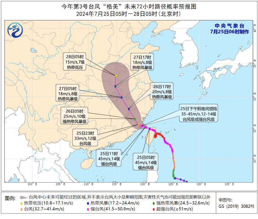 中央气象台7月25日06时继续发布台风红色预警:今年第3号台风“格美”的中心已于今天(25日)00时前后在台湾省宜兰县南澳乡沿海登陆,登陆时由超强台风级减弱为强台风级,中心附近最大风力有15级(48米/秒),中心最低气压945百帕。