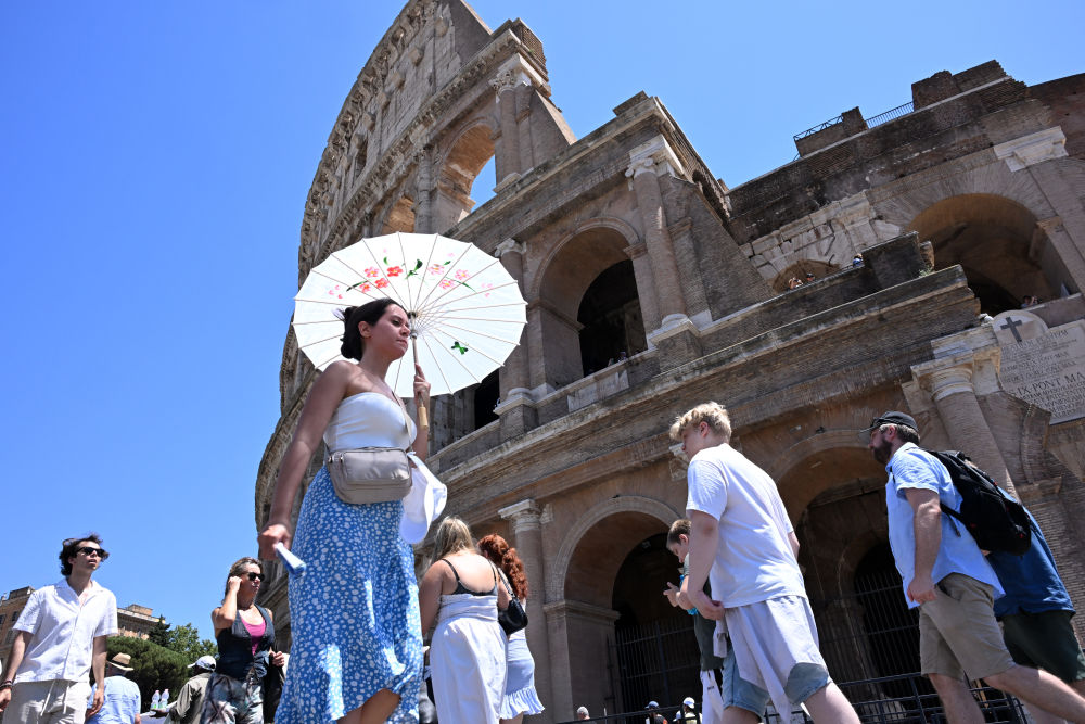 图为2024年7月12日,一名游客打伞经过意大利罗马斗兽场。新华社发(阿尔贝托·林格利亚摄)