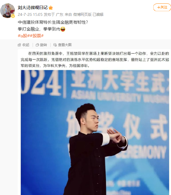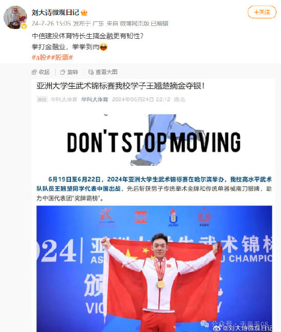 另有微博大V称,该实习生为华中科技大学体育学院学生,在刚刚结束的2024年亚洲大学生武术锦标赛上,还拿下了男子传统拳术金牌和传统单器械南刀银牌。