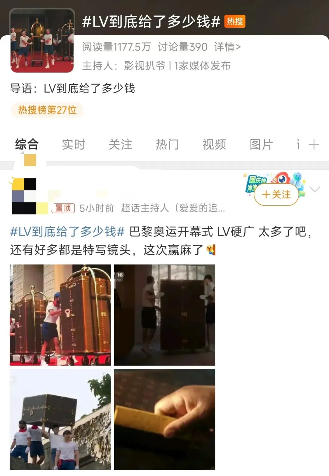 还有网友看巴黎奥运会开幕式感慨,LV赢麻了。巴黎奥运会LV硬广等内容也登上了微博热搜。有网友表示,LV到底给了多少钱?
