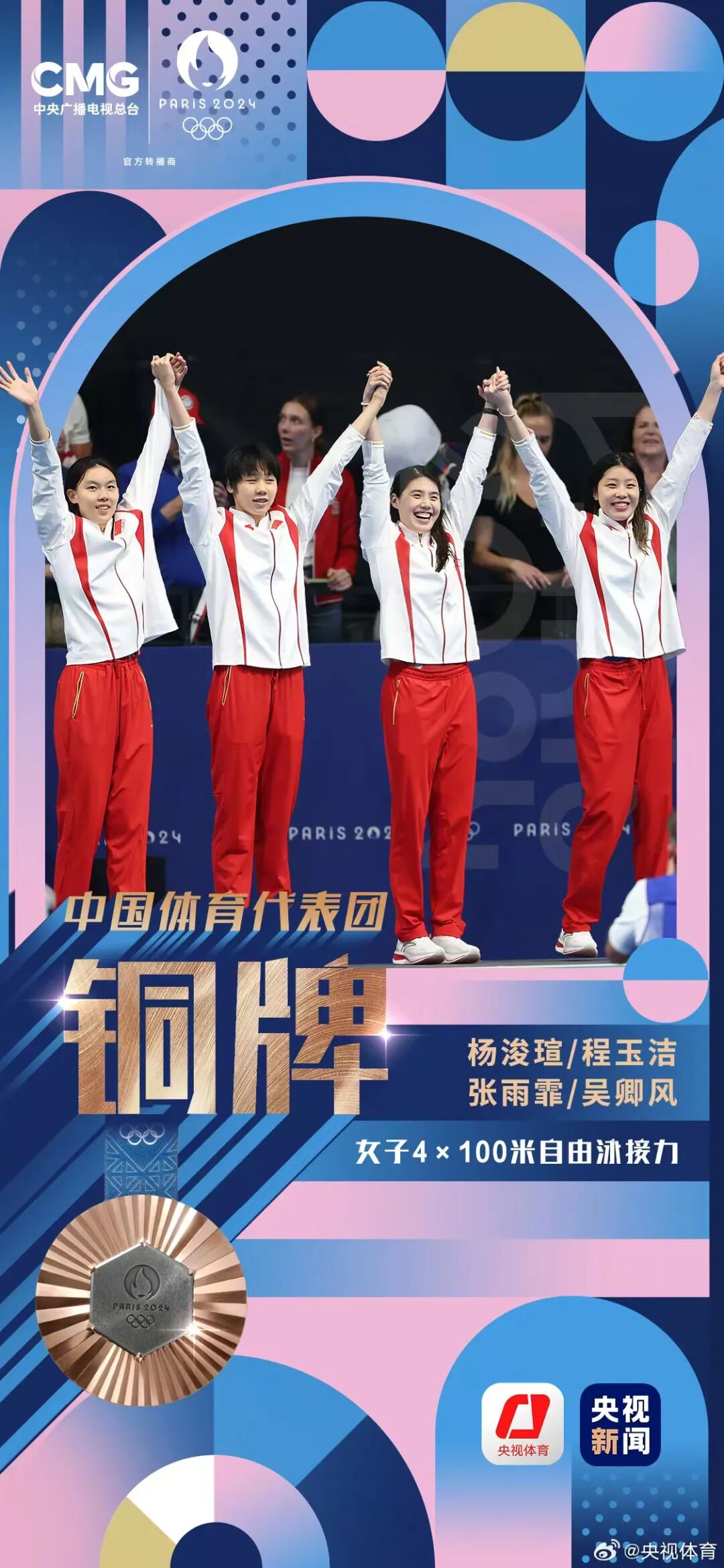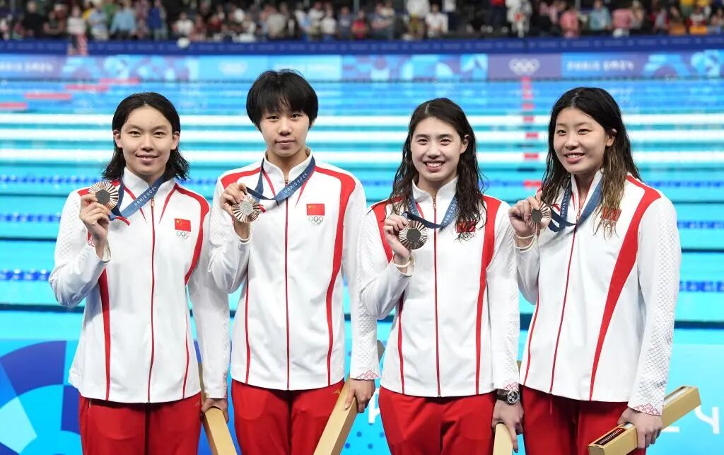 这是中国游泳队首次在奥运会上夺得女子4X100米自由泳接力项目奖牌,并以3分30秒30的决赛成绩刷新了亚洲纪录。