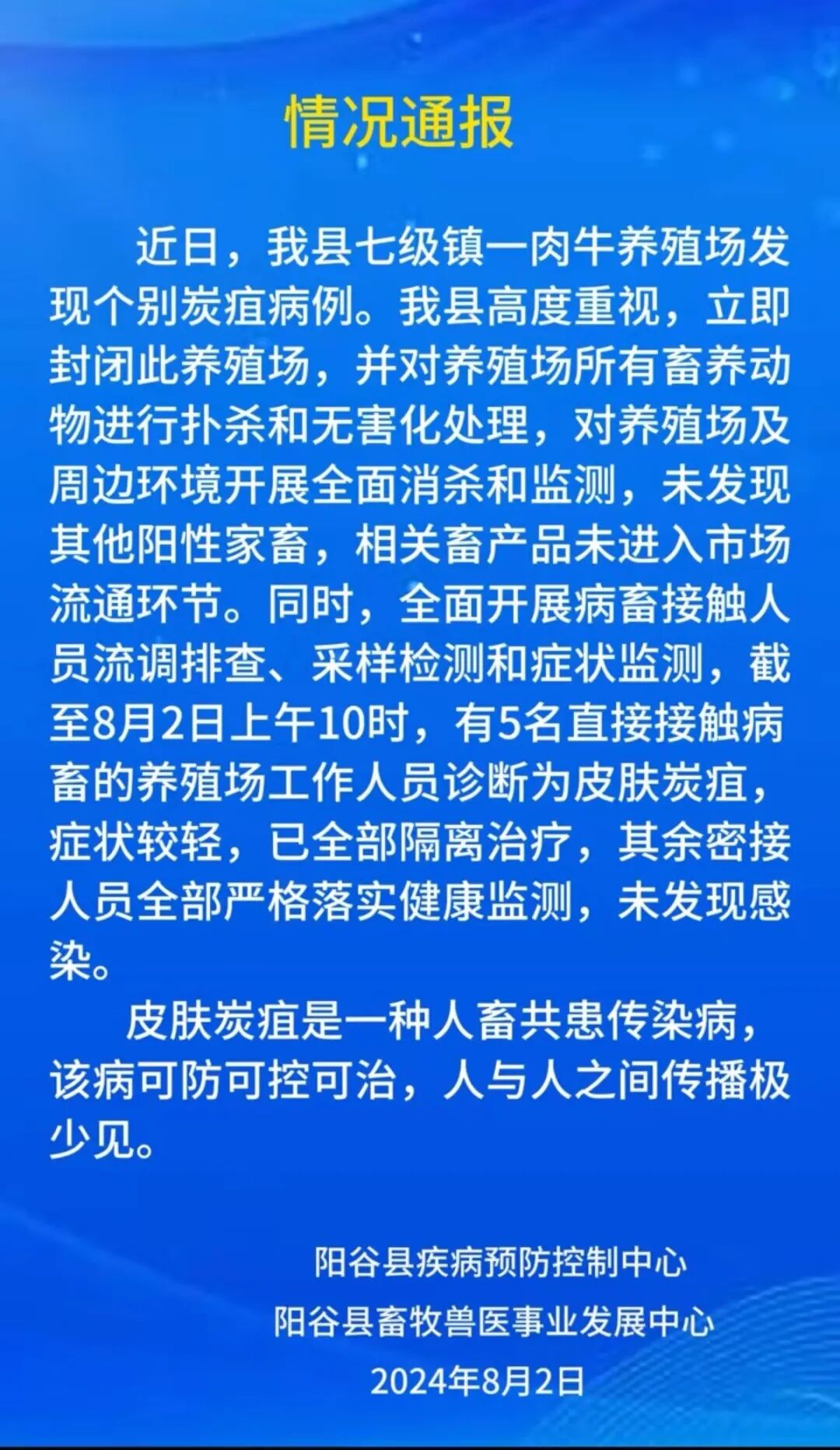 截至8月2日上午10时,有5名直接接触病畜的养殖场工作人员诊断为皮肤炭疽,症状较轻,已全部隔离治疗,其余密接人员全部严格落实健康监测,未发现感染。