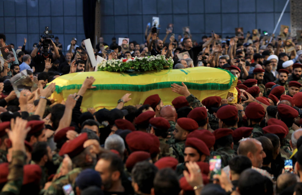 8月1日,在黎巴嫩首都贝鲁特,真主党支持者参加真主党高级军事指挥官福阿德·舒库尔的葬礼。新华社发(比拉尔·贾维希摄)