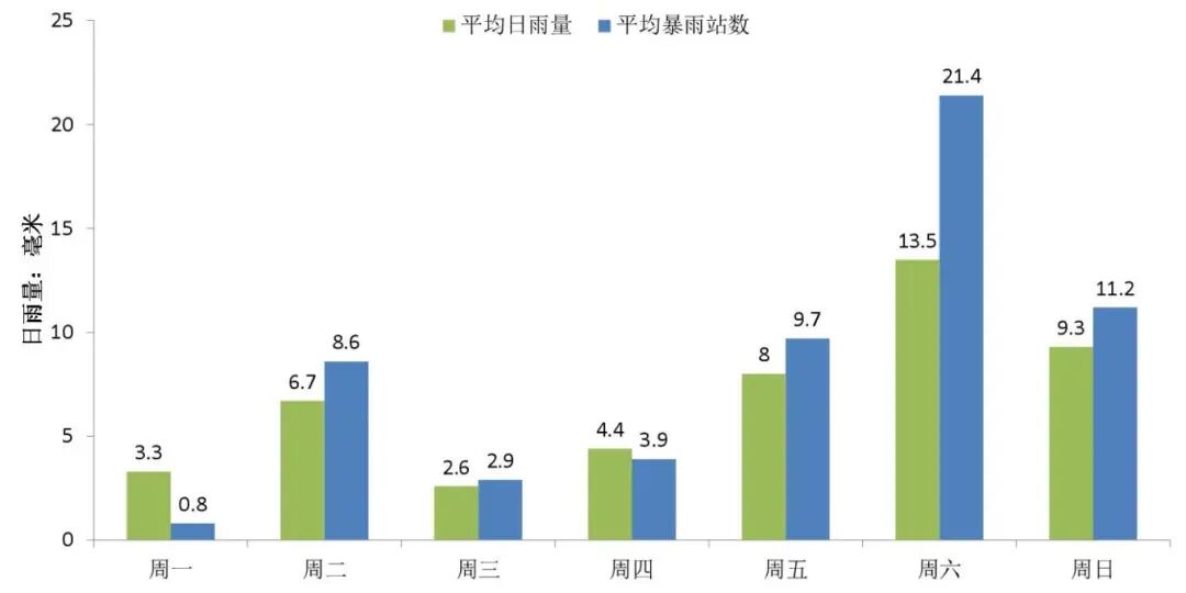 今年以来深圳一周逐日平均雨量(毫米)和暴雨站数(天)。