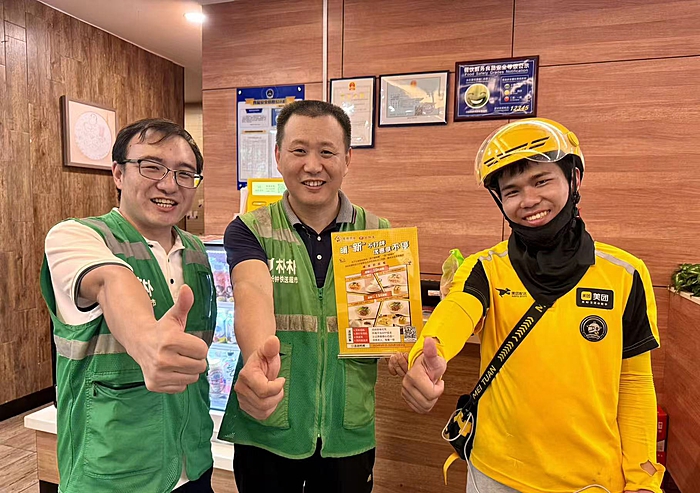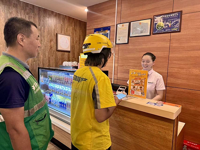 一位外卖“小哥”身穿醒目的黄色外卖服装,头盔下的脸庞略显疲惫,他走到点餐台前,微笑着指了指摆在点餐台上的海报,店员立刻会意,熟练地为他下单。随后,“小哥”找了个位置坐下,不一会,一碗热气腾腾的西红柿鸡蛋面就放在了他面前。8月3日,深晚记者来到位于车公庙的一家面点王餐厅,看见店里醒目地张贴着写着“暖‘蜂’不打烊,优惠享不停 ”的海报,经了解,这是面点王近日为快递员、外卖员等新就业群体推出的关爱活动。