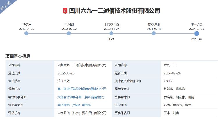 日前,证监会已同意四川六九一二通信技术股份有限公司(下称“六九一二”)首次公开发行股票并在创业板上市的注册申请,军工装备板块即将再添新成员。