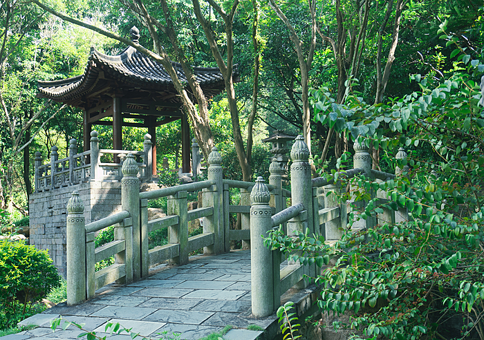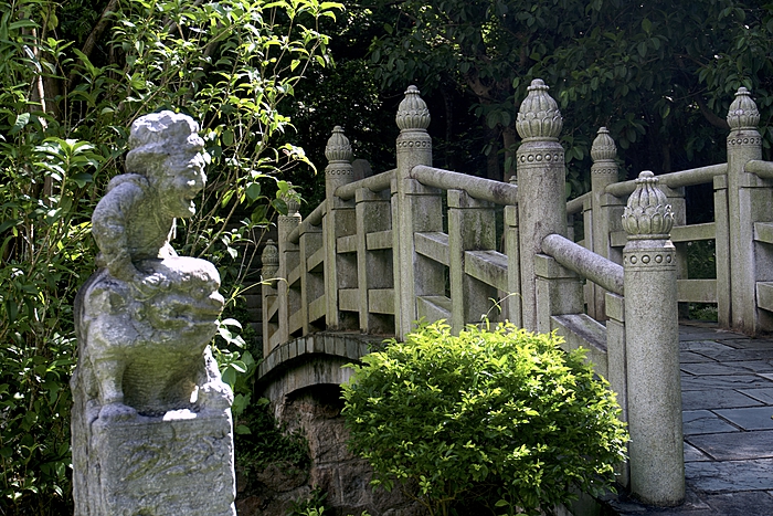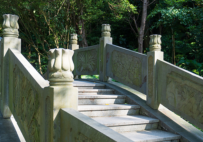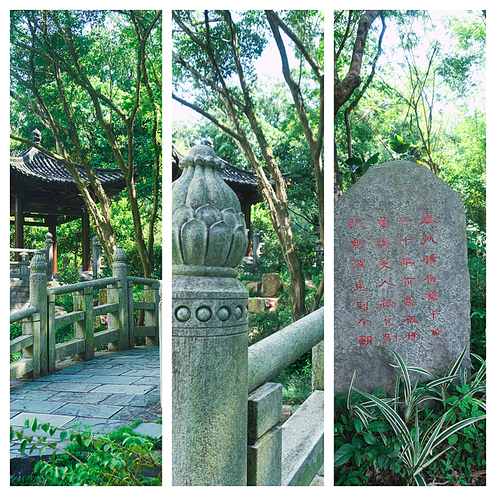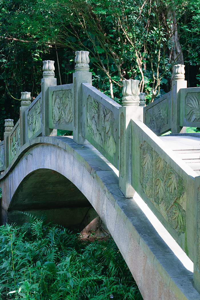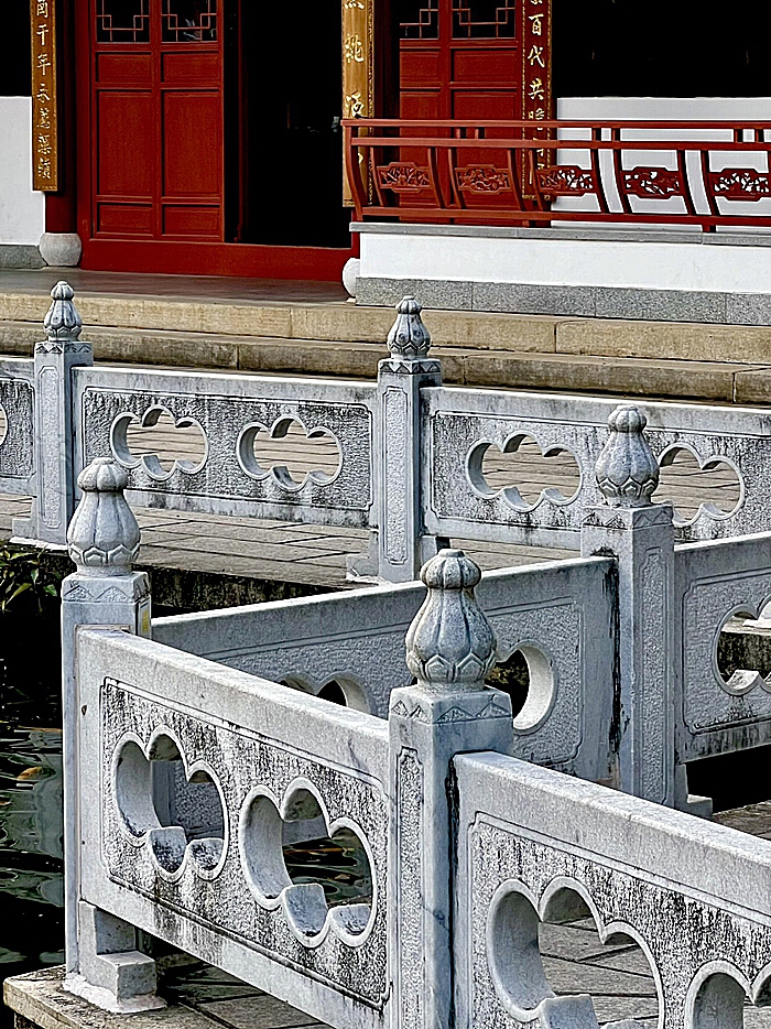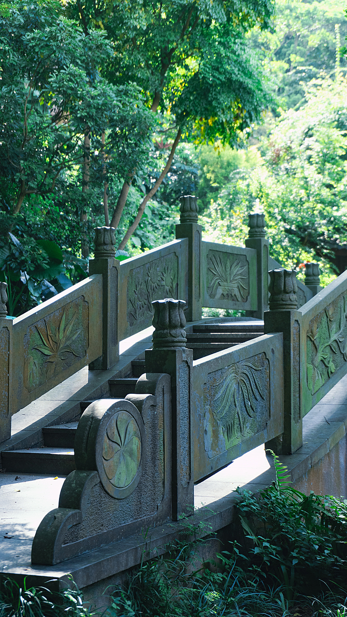 园内的“断桥”是很多情侣定格幸福瞬间的热门地。它是一弯拱形小石桥,静静地卧在一汪碧潭上。桥身以灰中透白的石头铺就,两头带阶梯,硬底鞋走上去会发出清脆的“哒哒”声。青石护栏上,刻着梅、兰、竹、菊、仙鹤、凤凰等传统吉祥纹样,桥柱也设计成精美的莲瓣状,古韵悠扬。