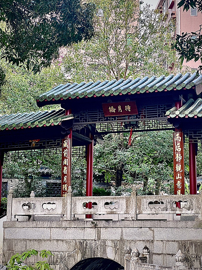 待月桥造型很特别,石质的桥身,搭配莲花石柱,典雅又实用。桥上的石护栏做了镂空设计,既装点了小桥,又依稀可见背后花草树木的倩影,营造出景中景的中式含蓄美学意境。桥上连廊是绿瓦红墙的传统中式建筑造型,整体为“品”字形结构,最高处的横梁上书“待月桥”,左右两个立柱则挂上了一副对联,为眼前美景注入浓郁的人文气息。