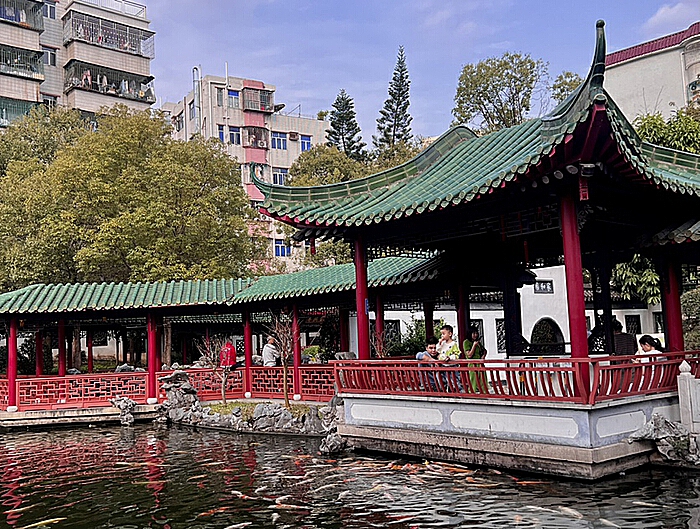 锦绣园是深藏于皇岗村内的一所苏式园林,园中亭台楼阁、小桥流水,茂林修竹、假山怪石遍布,将江南水乡的气韵完美复刻,园外则是高楼林立热闹繁华的福田CBD。踏进园中,可感受独一份的“身在闹市,心在山林”的清幽与惬意。