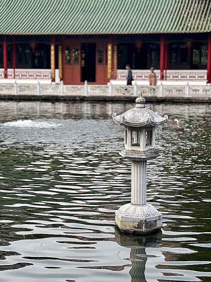 倘若断桥过于拥挤,也别急,不远处还有一个唐风园林——苍苔园。在那里,一座古拙的小石桥架在潺潺流水之上,雕刻着精美石狮子的拴马桩、四角攒尖方亭、仿唐石牛、石灯、石塔散布于周围,自成一片宁静的小世界,踏入其中仿佛步入千载岁月的轮回。