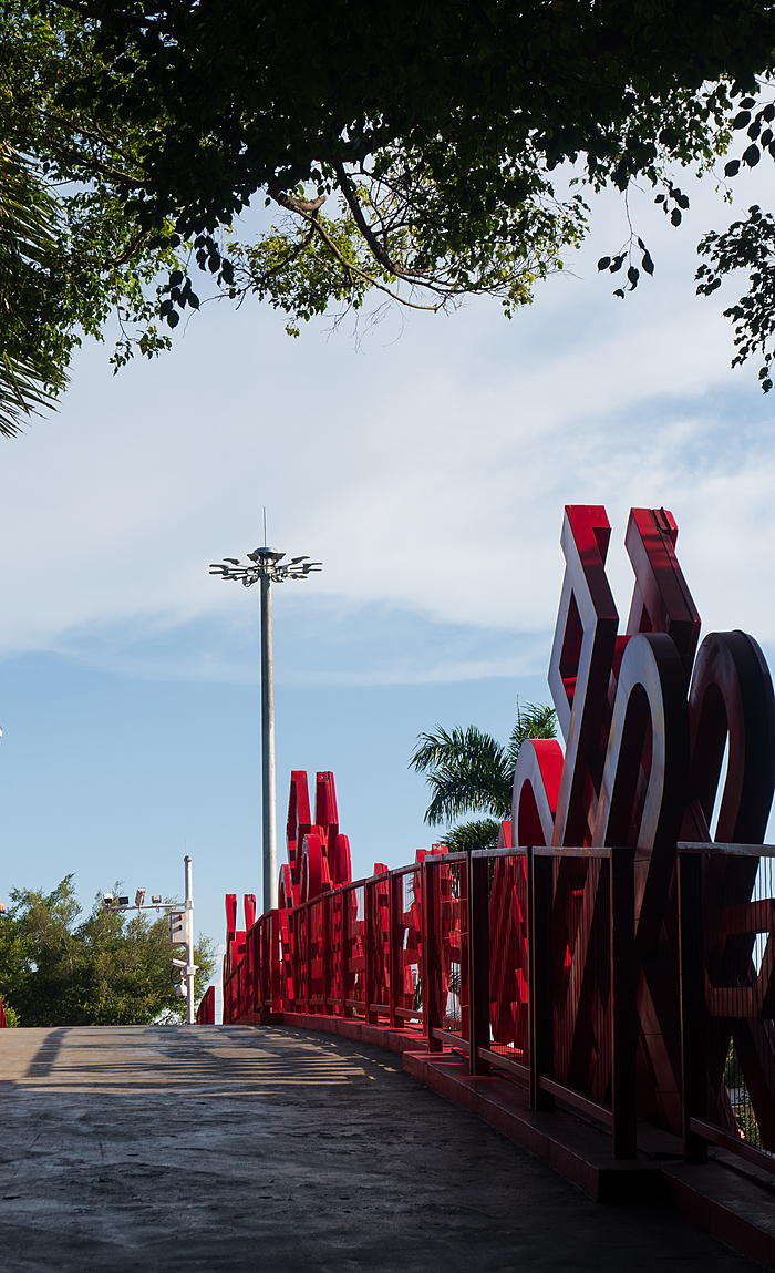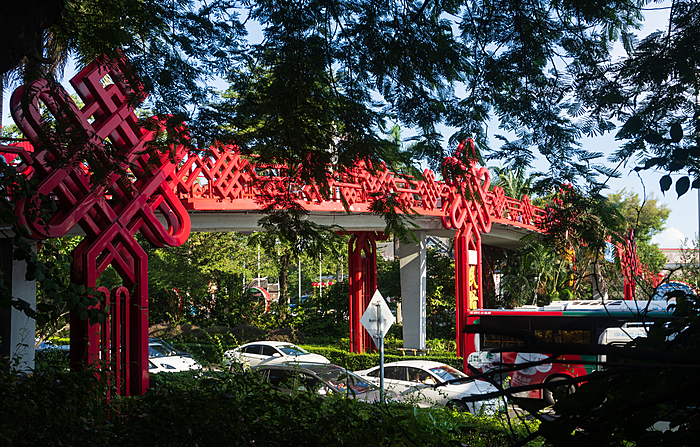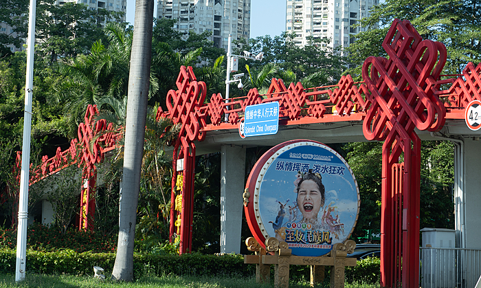 在深圳著名景点锦绣中华民俗村前广场,一架飞虹横跨深南大道,鲜艳的红色中国结,装点了桥面,也赋予深南大道一抹典雅灵动之美。因热闹喜庆的外形,加上多次举办过大型集体婚礼,大家亲切地把它叫做“喜桥”。