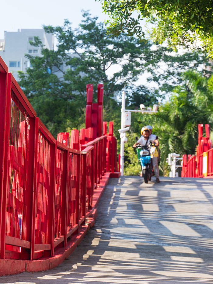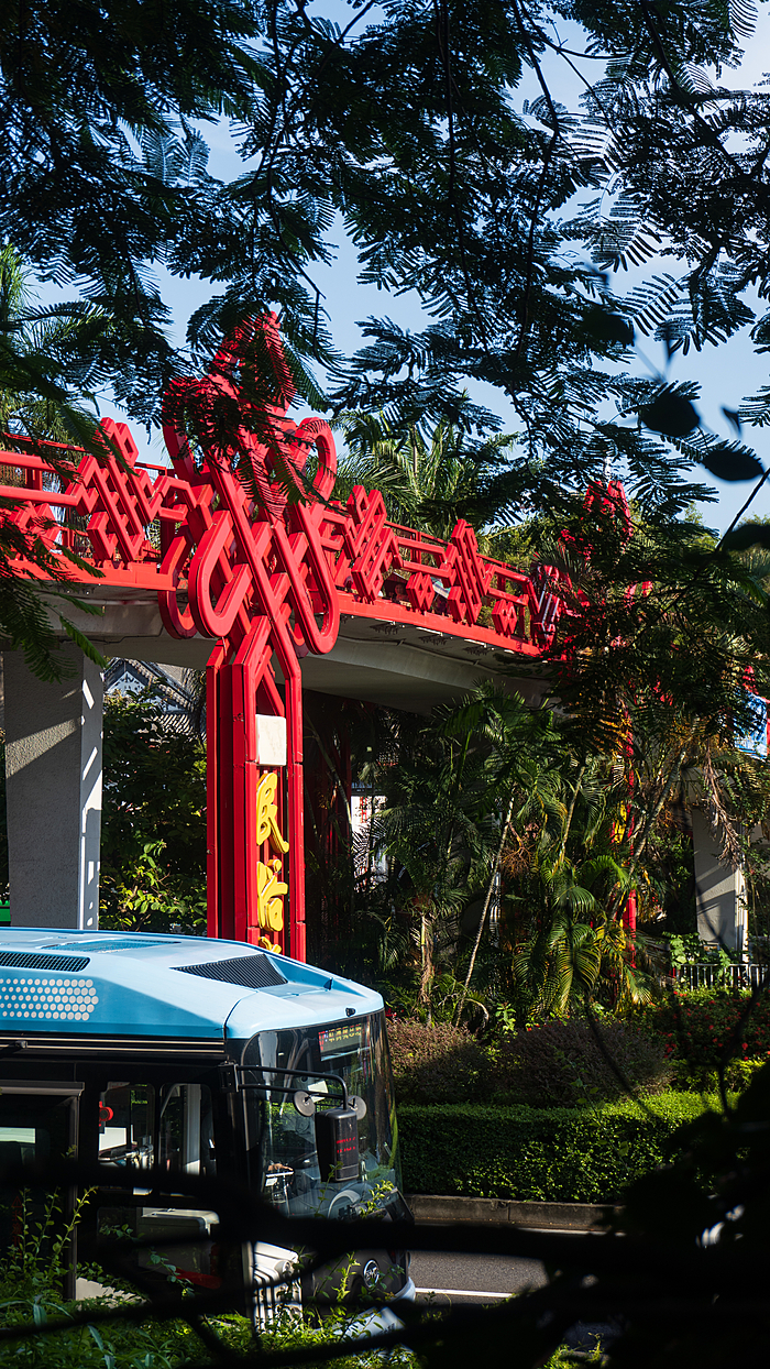 喜桥之上,常年游人如织,欢声笑语不断;桥下车水马龙,尽显都市繁华;桥边四季常青的椰树、凤凰木影影绰绰,清风拂过,绿树映红桥的诗意浪漫便晃进眼底;白日里,它有蓝天白云作伴;夜间,它则披上流光溢彩的新装……赏喜桥之美,不论时辰,不挑角度,可谓“淡妆浓抹总相宜”。