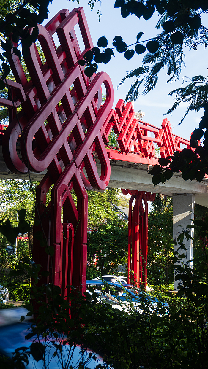 “喜桥”的设计处处透着中式美学。在造型上,以红色作为主基调,并大量运用中国结元素,将传统喜庆氛围拉满。在选材上,采用彩色塑料板作为外装饰材料,高度还原中国结的形态和颜色,将古典之美与现代科技完美融合。
